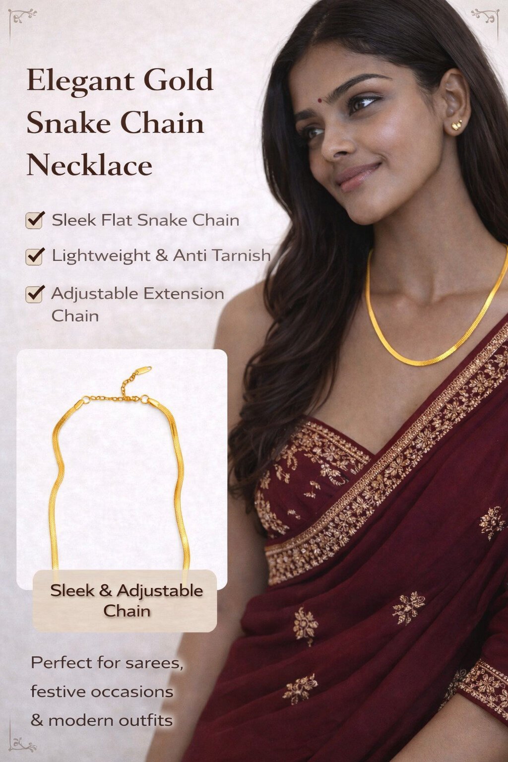 Crafted with a premium anti tarnish finish, this gold snake chain necklace offers long-lasting shine, durability, and a smooth, skin-friendly feel. Its lightweight and flexible design ensures all-day comfort, making it perfect for regular wear.