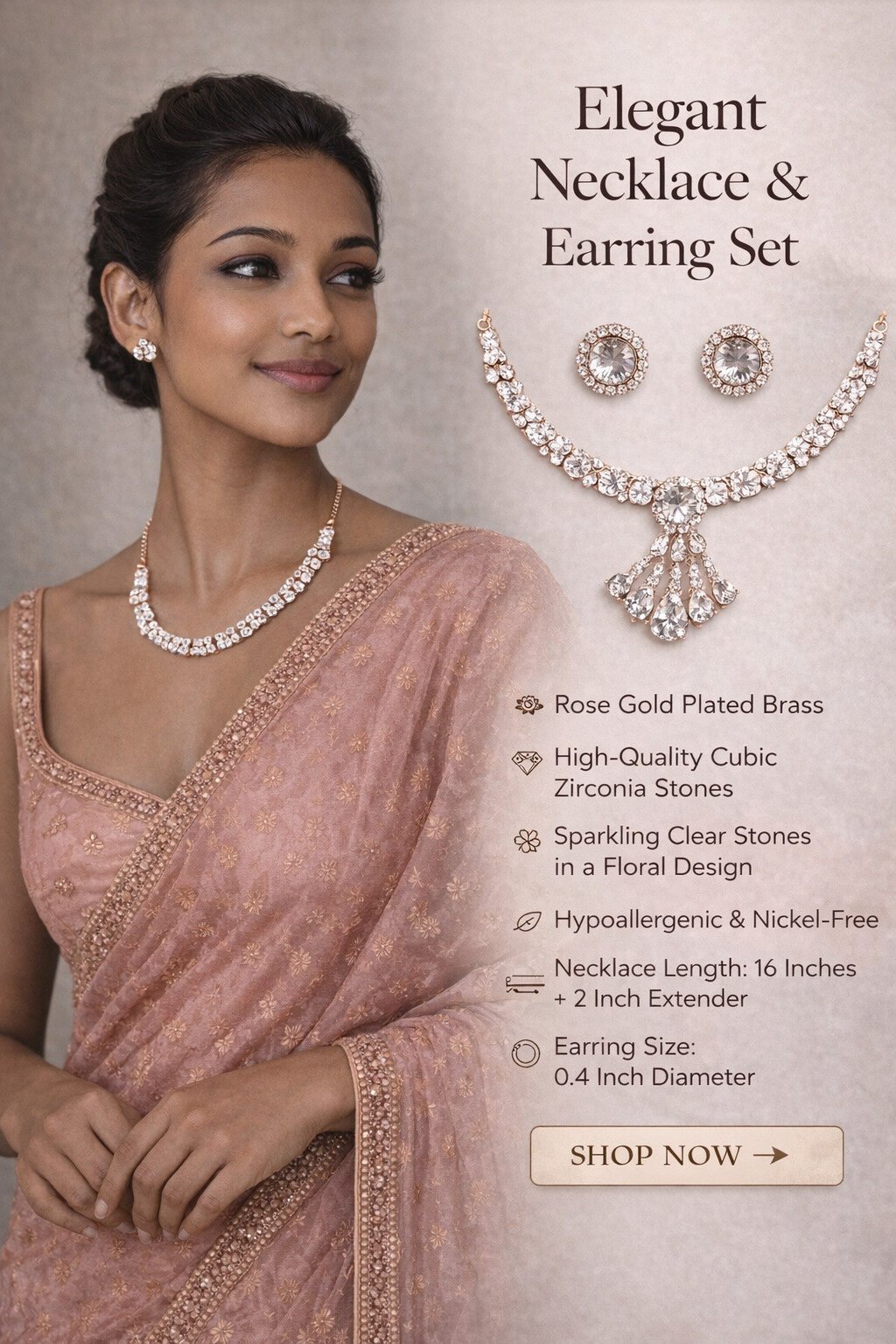 Designed for women who appreciate sophistication, the necklace features a graceful floral-inspired design paired with matching stud earrings. The rose gold plated finish adds a luxurious touch, making it perfect for weddings, festive occasions, parties, and evening wear.