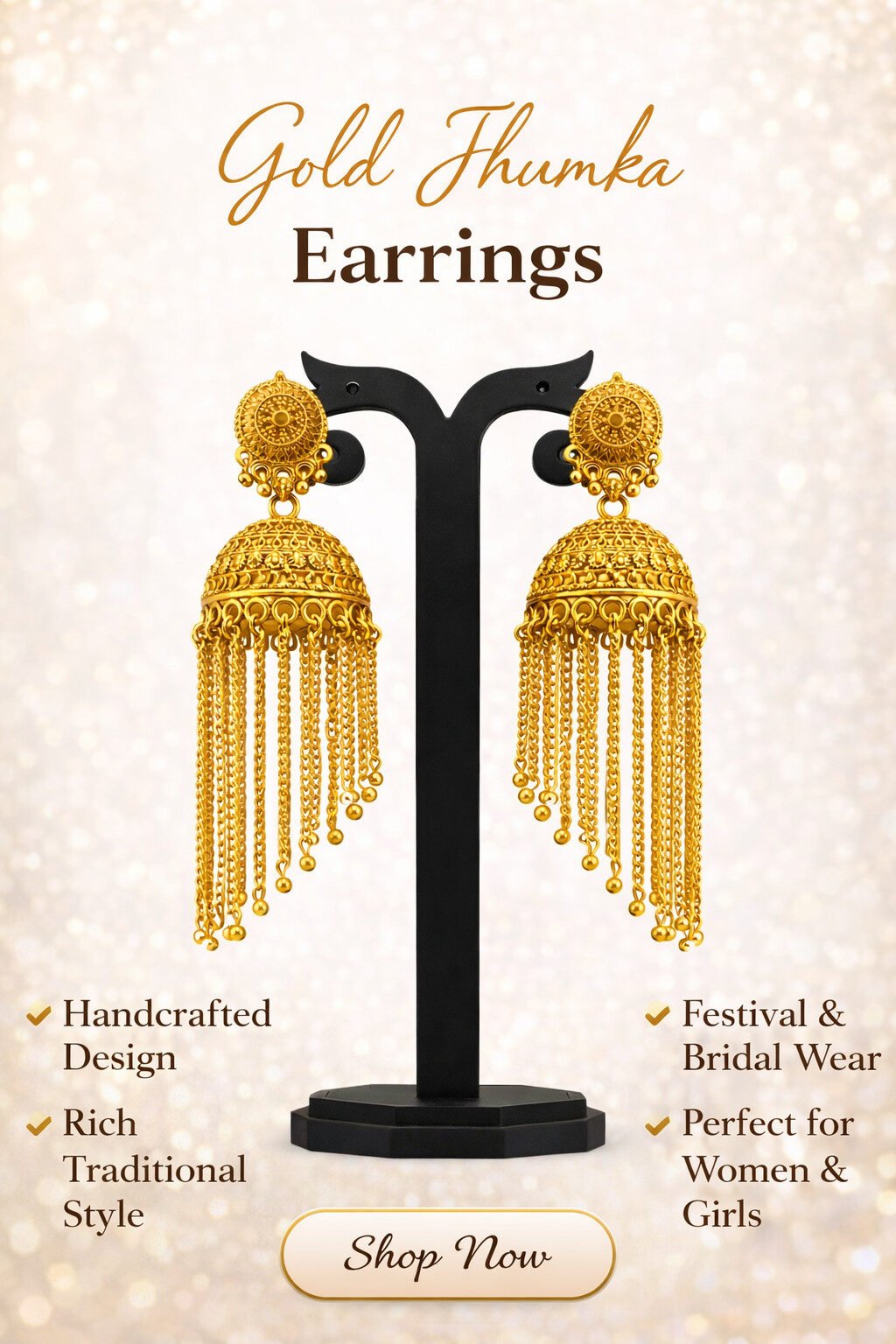 Make a timeless style statement with these Elegant Women’s Exquisite Gold Jhumka Chandelier Earrings, crafted to celebrate traditional beauty with a luxurious touch. Featuring an intricately detailed dome design with cascading gold chains, these jhumka earrings offer rich movement and a regal finish that instantly elevates your look.
