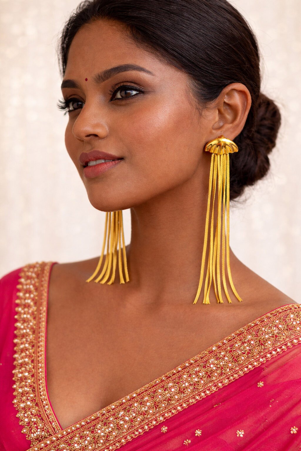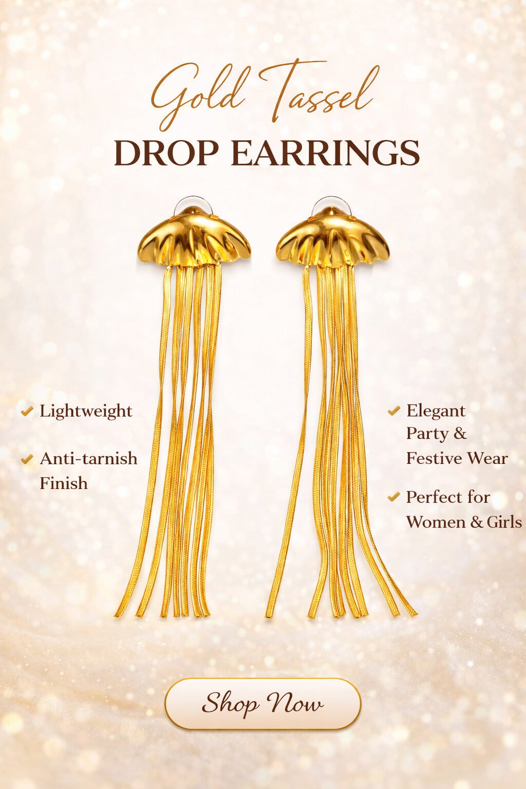 Perfect for parties, festive occasions, weddings, and special celebrations, these shimmering gold tassel drop earrings for women pair beautifully with sarees, lehengas, gowns, and western outfits. Whether you’re dressing up for a celebration or adding glamour to a casual look, these earrings deliver elegance and style every time.