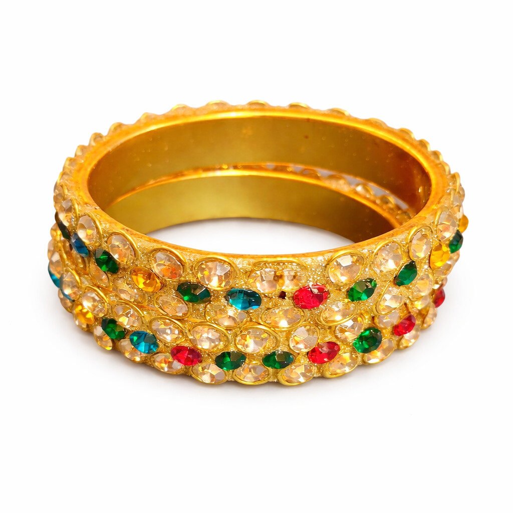 Crafted from high-quality alloy and finished with a glossy gold plating, the bangle features beautifully arranged multicolor crystals that reflect light and create a rich, eye-catching appeal. Its comfortable fit and timeless design make it suitable for both everyday festive wear and special celebrations.